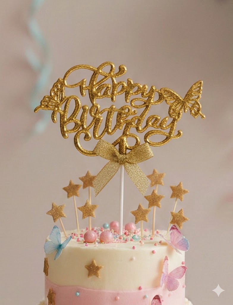 CAKE TOPPER HAPPY BIRTHDAY METALIZADO CURSIVA MARIPOSA DORADO