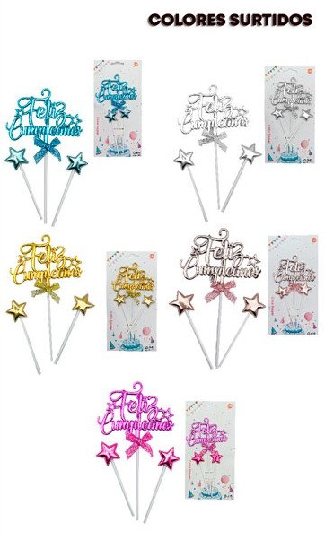 CAKE TOPPER FELIZ CUMPLEAÑOS METALIZADO 3PCS ESTRELLAS COLORES SURTIDOS