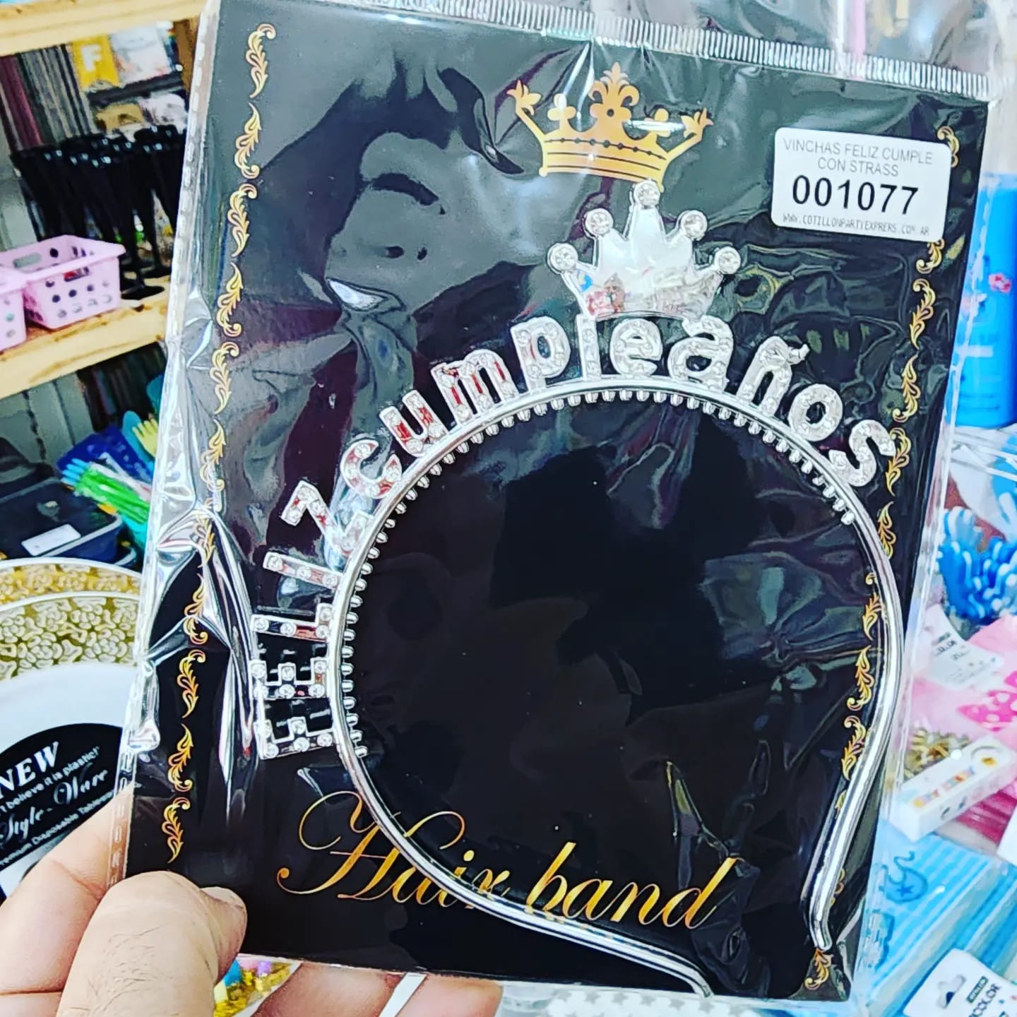 VINCHA FELIZ CUMPLEAÑOS CON STRASS PLATEADA X 1 UNIDAD