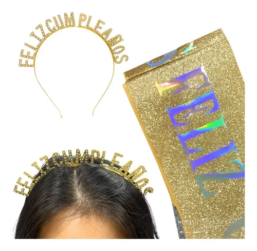 SET VINCHA STRASS Y BANDA FELIZ CUMPLEAÑOS DORADO