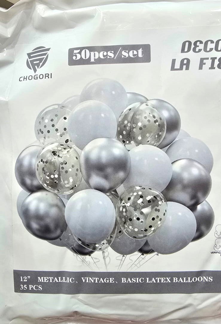 SET 52 PCS GLOBOS LATEX/CHROME/STANDARD/CONFETTI CINTA+PUNTO PEG. PLATA/BLANCO