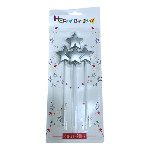 VELA ESTRELLA METALIZADA CON PALITO 4PCS 15CM PLATA